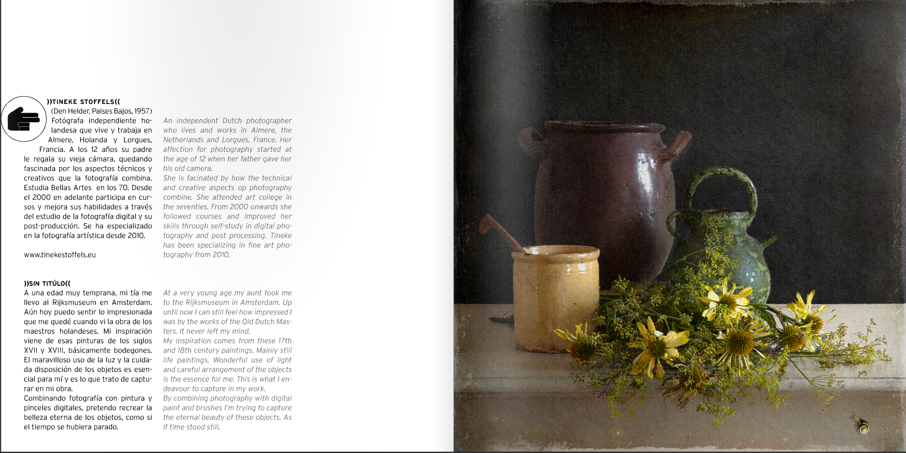 Tineke Stoffels is brilliant at composition and captures light in a way that still life photographs look like paintings. She combines photography with digital paint, which adds to the vintage, 17th. century style painting effect.